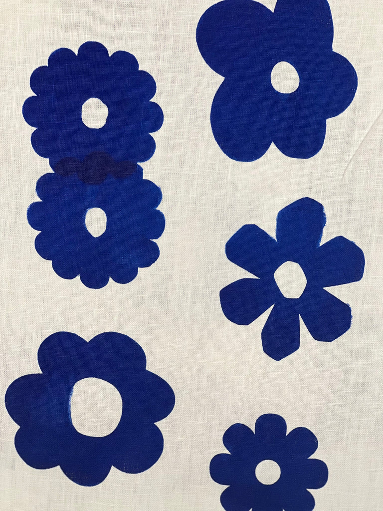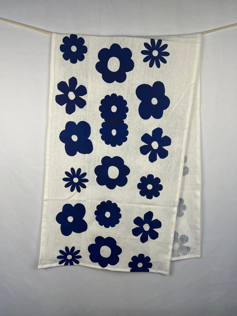 uniquely designed and handprinted using eco-friendly inks onto premium off white linen, this classic blue 'once & floral' flower table runner will be in bloom all year round.
