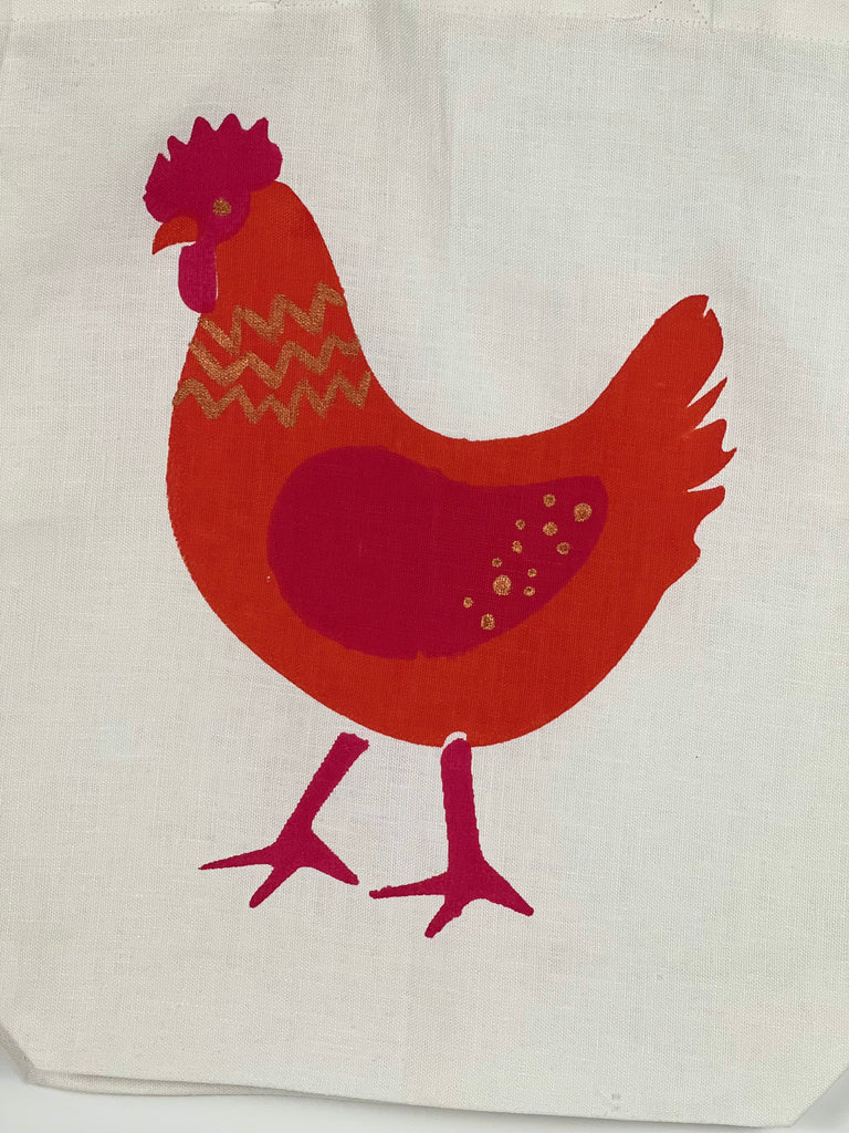 Uniquely designed and handprinted using eco-friendly inks onto premium linen, this 'Practical Yolker' chook linen tote will have you smiling all the way from A to B.