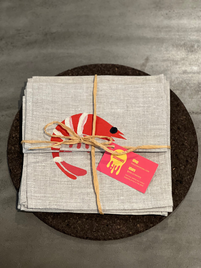 uniquely designed and handprinted using eco-friendly inks onto premium oatmeal linen, these 'prawn to be wild' napkins will be going off during any meal, or are a great complement to a traditional Aussie seafood Christmas.
